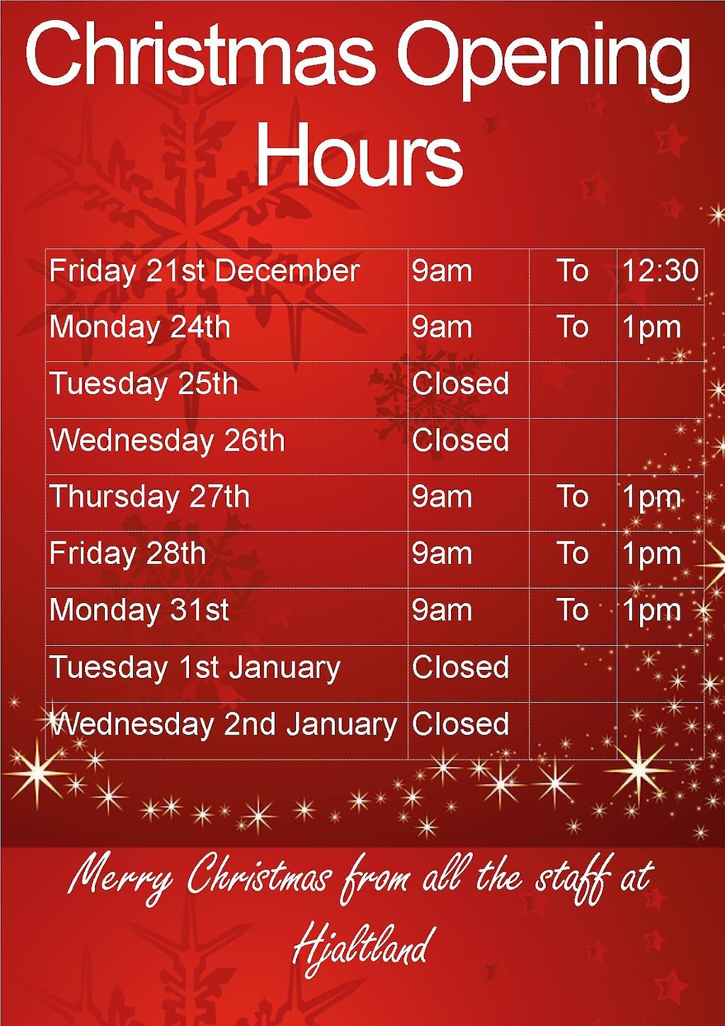 The office opening hours over the festive period will be as follows: